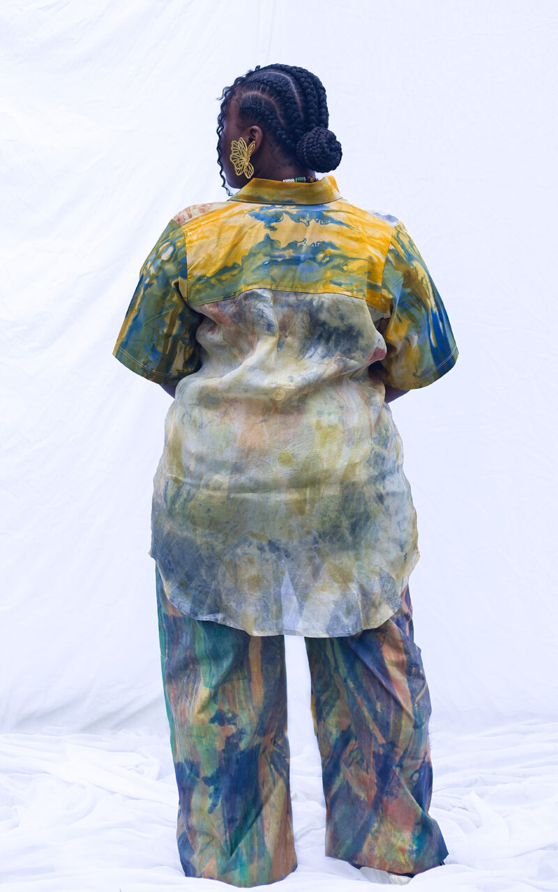 Hand-died batik, handmade brass buttons. (hand brushed, cotton and organza)
