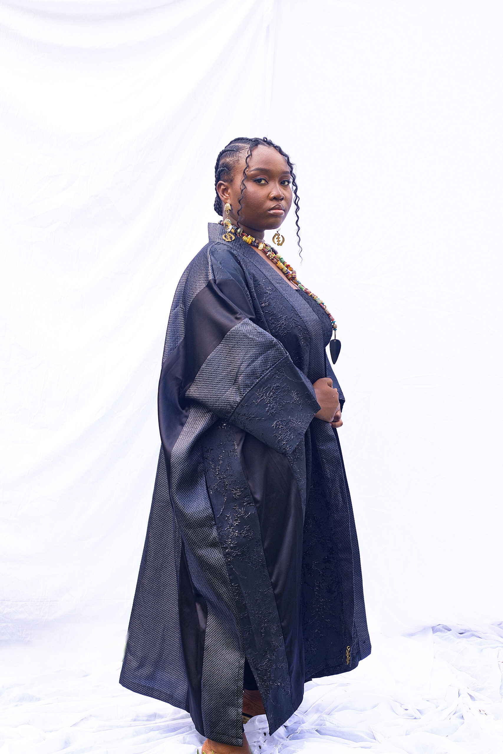The Anika Kimono radiates opulent elegance and timeless sophistication. Woven in luxurious silk-brocade, its rich texture and subtle shimmer reflect light and depth in every fold. Cut in a graceful, open-kimono silhouette, it drapes effortlessly, offering both structure and ease.