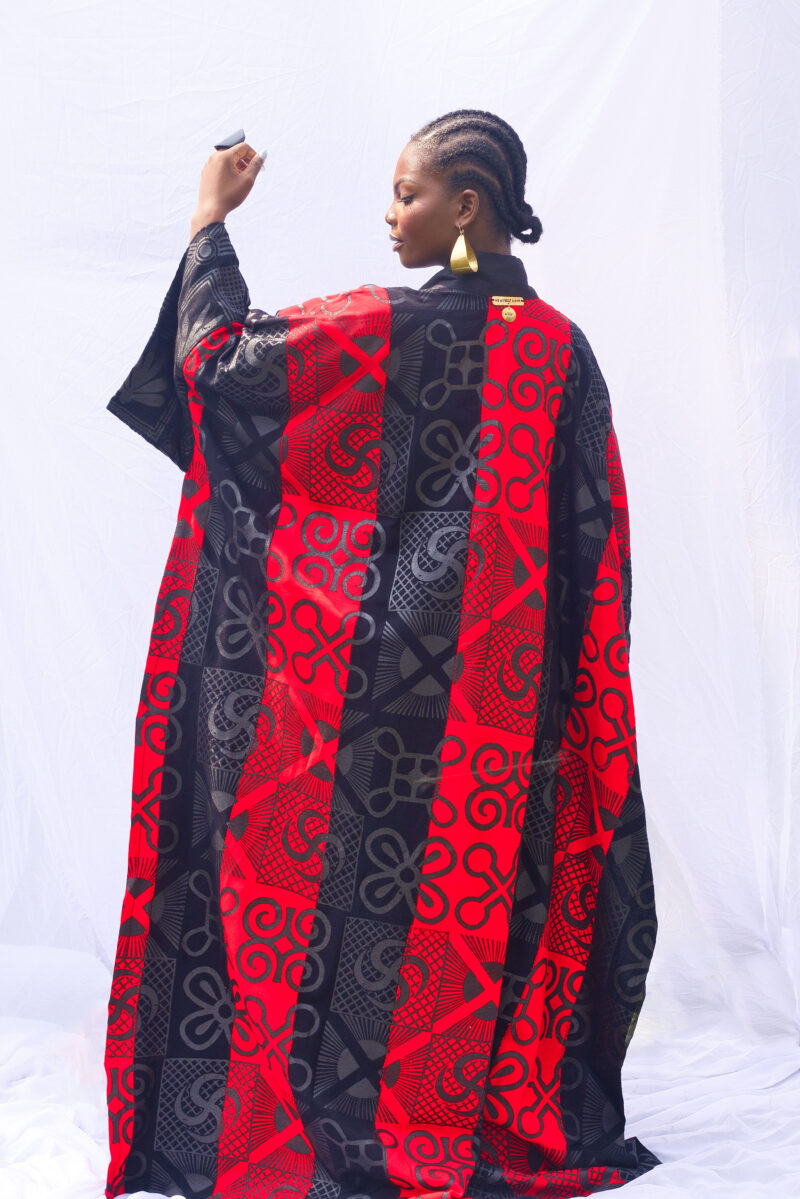 The Nhyira Kimono bridges bold heritage and fluid elegance. Crafted from richly woven Kente cloth and edged with linen trim, it drapes gracefully in a relaxed, open silhouette. The structure of the Kente gives the form presence, while the linen trim softens the identity, making it versatile for both daywear and elevated evening styling.