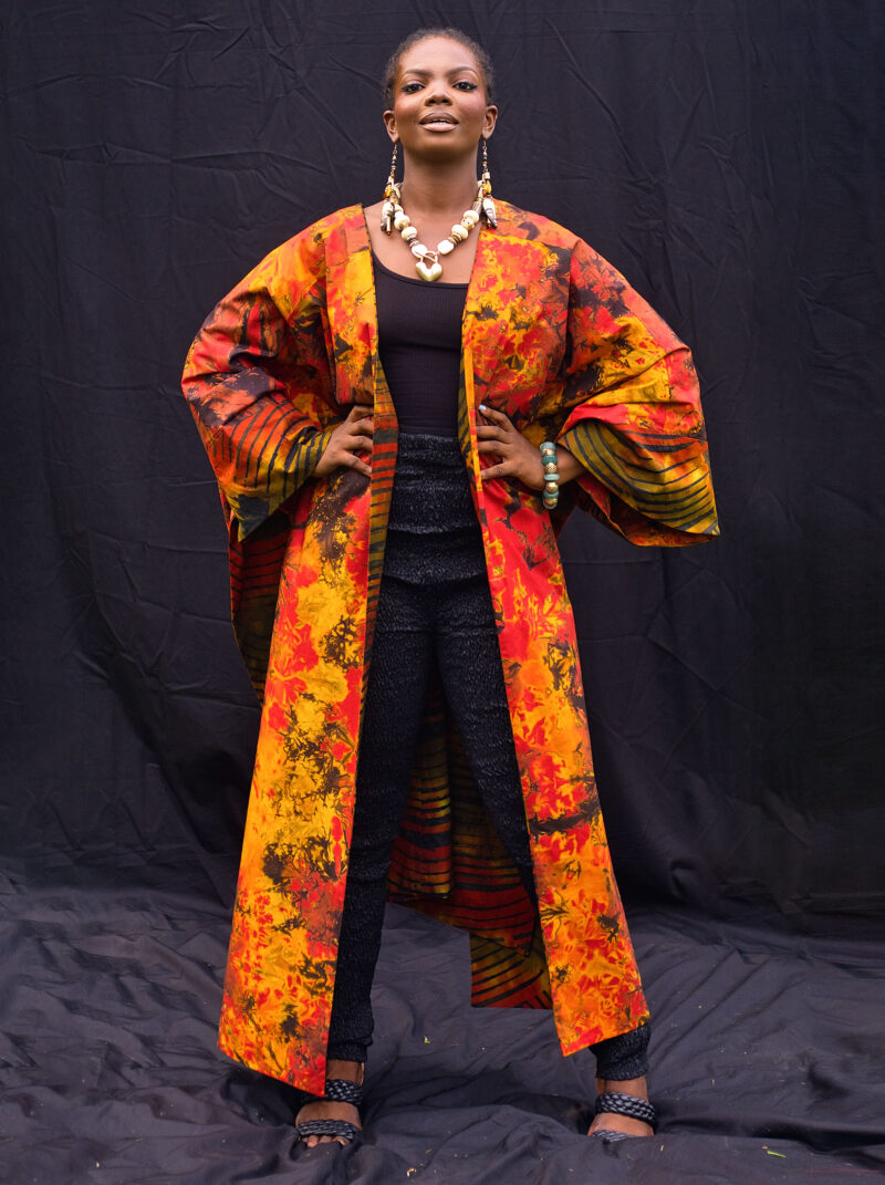 The Serwaa Kimono offers two striking looks in one — it’s beautifully reversible, showcasing hand-dyed batik on both sides. Its flowing silhouette drapes with ease, making it ideal as a layered piece or a bold stand-alone wrap. Soft in motion but rich in character, Serwaa brings artisan charm and versatile styling to your wardrobe.